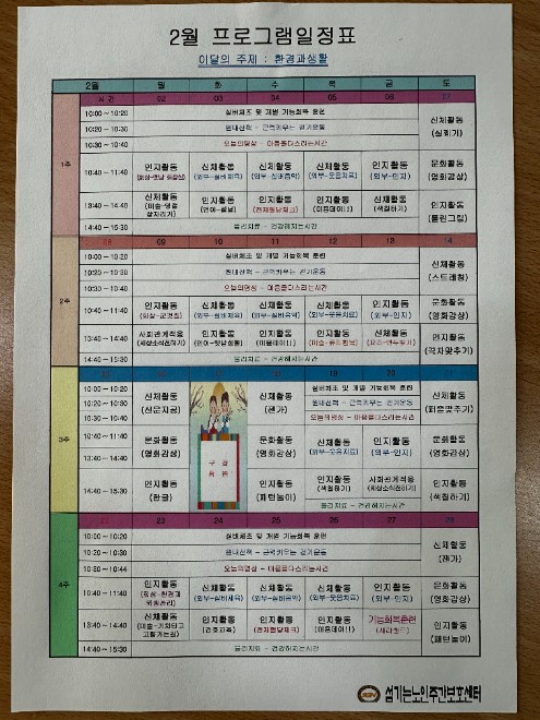 2026년 2월 프로그램 일정표 올려 드립니다. 추운 날씨에 옷 따뜻하게 입으시고 감기 조심하세요.^^ |